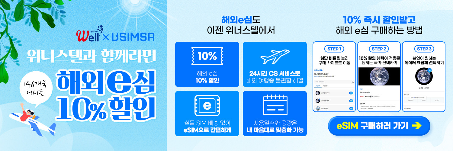 이벤트 이벤트 지난이벤트보기 이벤트 당첨자 발표 [진행중] [신세계면세점 제휴 이벤트] 이벤트 기간 : 2024-08-20 ~ 2025-12-31 [진행중] [위너스텔 해외eSIM 서비스] 이벤트 기간 : 2024-02-22 ~ 2025-12-31